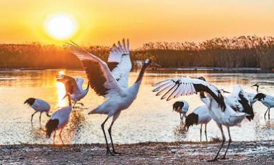 丹頂鶴在遼寧省盤錦市遼河口國家級自然保護區嬉戲。孫小偉攝(人民圖片)