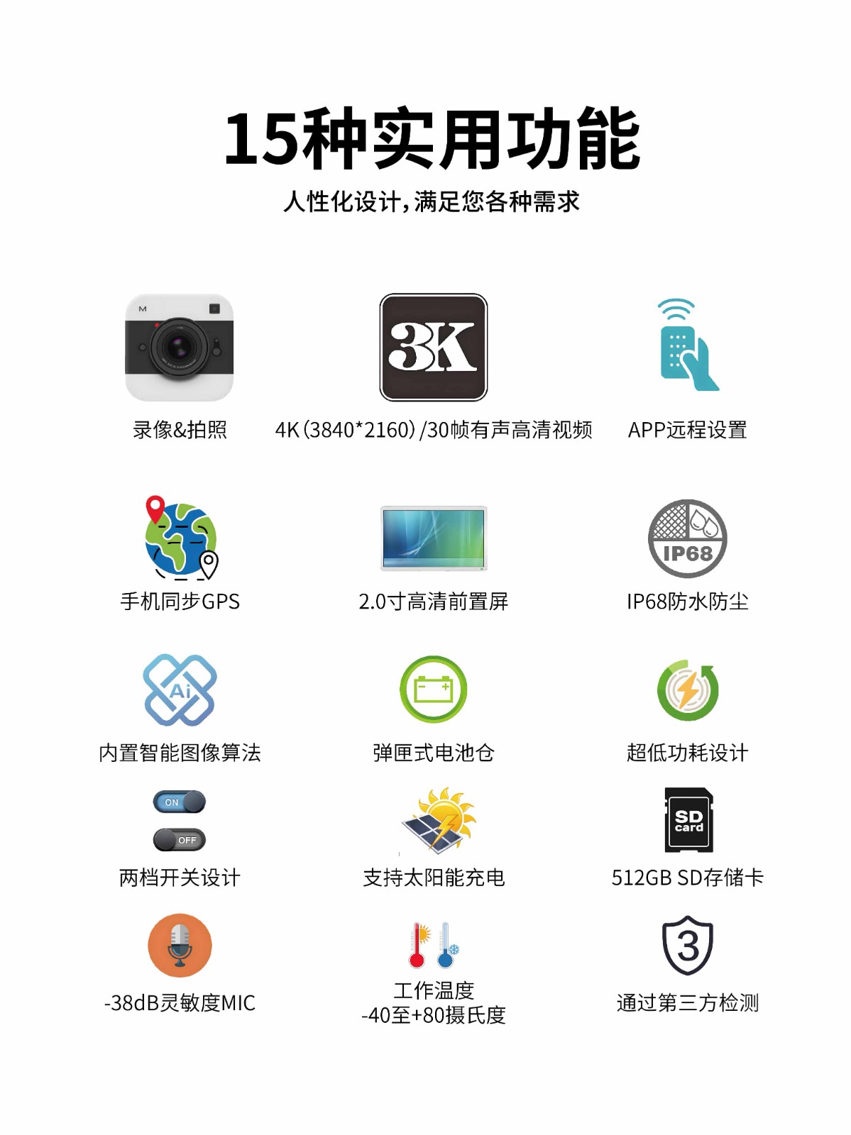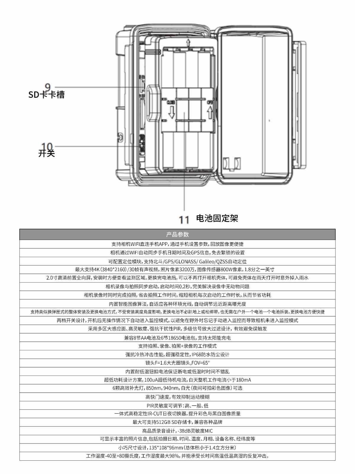 最大支持4K(3840*2160)/30幀有聲視頻,照片像素3200萬,圖像傳感器800W像素,1.8分之一英寸 支持相機(jī)Wifi直連手機(jī)APP,通過手機(jī)設(shè)置參數(shù),回放圖像更便捷 相機(jī)通過WIFI自動同步手機(jī)日期時間及位置信息,免去繁鎖的設(shè)置 2.0寸高清前置全向屏,安裝時方便查看監(jiān)測區(qū)域。更換完電池后,可以不再打開相機(jī)殼體,可避免殼體在雨天打開時意外掉入雨水